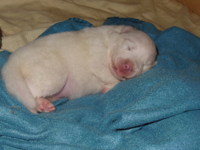 Delluhan on tosiaan ollut ihan sieltä alkumetreiltä asti epävirallinen suosikkini, jonka kotiin jätöstä aika ajoin olen haaveillut vähän enemmänkin. Tässä pojassa on vain sitä jotain! Dellussa on sellaista oikein perinteistä koiranpentumaisuutta. Pojasta tulee mieleen kaikki ne elokuvien koiranpennut, joita ostajat roikottavat ilmassa ja ihailevat eläinkaupoissa. Rusetti vain puuttuu kaulasta ja poika olisi kuin jonkin kultaisennoutajan miniversio. Dellusta tulee ulkoisesti hieman mieleen isänsä samanikäisenä. Poika on edelleen pentueen kookkain ja sen kyllä huomaa. Dellu kulkee nimittäin todellisin omistajan elkein pitkin mökkituvan lattiaa. Dellun viehätys piilee siinä, että poika tykkää leikkiä ja riehua, mutta sitten kun Dellun ottaa syliin, poika rauhoittuu välittömästi. Syliin päästessään Dellu on vetelä kuin mikäkin makaroni ja poikaa voi käännellä ja väännellä melkein mihin suuntaan vain eikä Dellu pane sitä lainkaan pahakseen. Dellua kuvaakin parhaiten varmaan sana "sylikoira". Dellu on todellinen rakkauspakkaus ja jos vain tämänhetkinen luonne säilyy, niin poika tulee varmasti olemaan sekä mukava lenkki- että löhöilykaveri. Kovasti myös toivoisin näkeväni tätä poikaa tulevaisuudessa näyttelyissä, mikäli kivekset vain laskeutuvat ja purenta pysyy siistinä. Painoa tällä jäbällä on huimat 1220 grammaa.