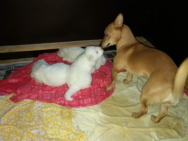 Pienoinen haaste on muuten kovettaa sydän näille kullanmuruille ja ottaa tiukka linja esimerkiksi tuon murinan ja haukunnan suhteen. Nämä ovat aivan kuin lelukoiria ja vaikka järjellä tietää, ettei pentujen äänekkääseen huomionhakuun kannattaisi kiinnittää huomiota, niin eihän noita voi vastustaa. Pakkohan niitä on heti mennä paijailemaan, nostamaan syliin ja antamaan pusuja. Nova on ottanut huomattavasti tiukemman linjan ja ihan sama kuinka paljon pennut huutavat, niin Nova ei korvaansa lotkauta ellei hänestä aika tunnu hyvältä. Olen myös vähän laskenut sen varaan, että tiukat tädit eli podengot, pistävät pentuja pian ruotuun. Valitettavasti jopa podengot tuntuvat olevan niin pentujen lumoissa, että tytöt murisevat vain toisilleen kisatessaan siitä, kuka pentuja pääsee nuuhkimaan ja hoitamaan. Ja tänään kun yksi tytöistä (taisi olla Lila) maisteli vähän Sirunkin etutassua, niin meidän vanha matami, jonka kärsivällisyys on tätä nykyä aika nolla, ei sanonut yhtään mitään. Mulkoili vain Nefiä vihamielisesti, ettei tämä tulisi varastamaan hänen uusinta pentuaan. Eli pahoittelut vaan uusille kodeille, taitaa melkoisen hemmoteltuja samojedeja olla täältä tulossa. 🙈
