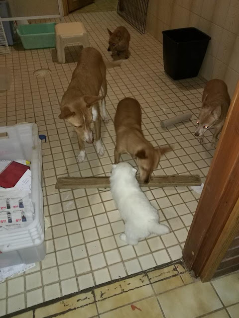Tänään pennut täyttivät 4 viikkoa ja tämä on tuonut kyllä aivan uuden vaiheen pentujen elämään. Podengot ovat vihdoin saaneet Novalta luvan hoitaa pentuja vähän enemmänkin. Kyllä Nova edelleen tasaisesti muistuttaa olevansa se oikea äiti, mutta nyt Gaia ja Freya saavat jo ihan oikeasti leikkiä ja hoitaa pentuja. Siru ja Nefi ehtivät jo itse asiassa hieman kyllästyä pentujen hoivaamiseen uutuuden viehätyksen kadottua muutamassa päivässä, mutta tänään 12-vuotta täyttänyt vanha rouva Sirukin intoutui kahden pennun kanssa vähän painimaan. Hestia meni pennuista aluksi ihan totaalisen sekaisin eikä olisi malttanut yhtenä yönä mennä edes nukkumaan, kun niin paljon mukavampi olisi ollut tökkiä ja nuuhkia pentuja. Hestia joutui silloin vielä nukkumaan portin toisella puolella ja varmaan puolituntia neiti yritti kehittää jonkin reitin pentujen puolelle aitaa. Tänään Hestia on jo ottanut vähän rauhallisemmin, mutta mielellään haluaisi pentuja tutkia aina kun ne rupeavat enemmän hakkumaan ja liikkumaan. Ainakin pennut tottuvat laumaelämään, kun podengot hääräävät koko ajan ympärillä. Eilen yritin itse asiassa vielä kotoa pois lähtiessäni laittaa pennut ja aikuiset eri puolille aitaa, mutta kun tulin takaisin, koirat olivat saaneet portit auki niin, että kaikki olivat onnellisesti yhdessä. Harjavallassa pitää kyllä kehittää jokin vähän kestävämpi aitaus, etteivät pennut pääse tekemään koko kämppään tuhojaan työpäivän aikana.