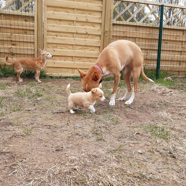 Komea Hex muuttaa Ouluun ja siellä pojan nimeksi tulee mahdollisesti Valo. Nimi on ihanan lähellä Hexin isoisän Waldon nimeä ja kyllähän podengot tuovat todellakin valoa arkeen. Hex oli vielä viikko sitten hieman "mitäänsanomaton", mutta viikossa on tapahtunut todella paljon ja nyt poika on todella innokas sähikäinen, joka mielellään painii ja leikkii kaikkien muiden kanssa. Hex myös järsii sormia todella innokkaasti. Poika on näistä pennuista kaikista skrodein ja jos hän vain seisoo ryhdikkäästi, todella komea! Seisominen miellytti Hexiä tänään kuitenkin jopa Spelliä vähemmän eivätkä edes herkut maistuneet seisottamisen yhteydessä. Pojan kuva jäikin siis aika vaisuksi vielä, mutta onneksi sain napattua pojasta ulkoa toisenkin seisomakuvan, joka löytyy hieman jäljelmpää. Siinä näkyy pojan ryhdikkyys huomattavasti paremmin.