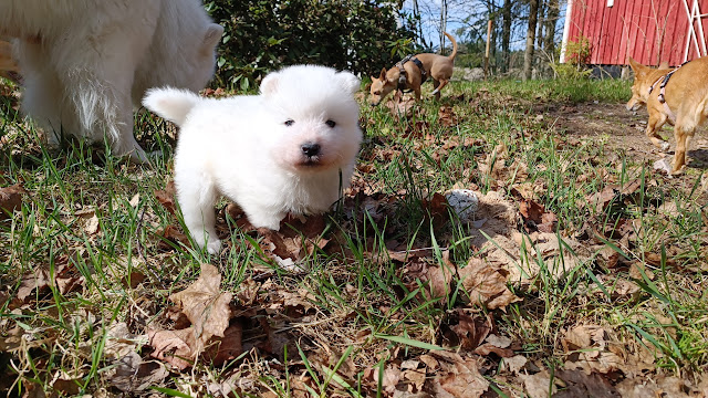 Helppo pentuarki on siis virallisesti takanapäin ja nyt olemme siinä pisteessä, että rupean laskemaan päiviä ja pian jopa tunteja ja minuutteja siihen hetkeen, että viisikko lähtee omiin koteihinsa. Kaikella rakkaudella sammaripentuja kohtaan, nämä osaavat kyllä olla oikeita hirviöitä sille päälle sattuessaan. 😂 Onneksi podengot ovat apuna pentuja kouluttamassa, niin saadaan pidettyä pennuilla tiukka kuri. Pientä päänvaivaa aiheuttaa pentujen riiviövaiheen lisäksi myös pentujen vatsat, sillä nyt pennuilla on ollut vatsa pari päivää vähän löysemmällä. Hilppa ja pennut syövät Brit Caren lammas penturuokaa ja pari päivää sitten avasimme uuden säkin. Koko porukalla meni samantien vatsa vähän sekaisin eli ilmeisesti ruoan laadussa on jotain eroa edelliseen säkkiin. Brit Care on ollut meidän sellainen luottoruoka jo useita vuosia, mutta sen jälkeen kun ruokaa muutettiin noin vuosi sitten, on sen laatu selvästi vaihdellut. Kyllä taas mietin, että olisi mukava ruokkia koirat ja pennut pelkällä raakaruoalla, jos siihen vain aika ja pakastetila riittäisi. Mutta näillä eväillä mennään ja tänä aamuna suurimmalla osalla pennuista oli onneksi jo vähän kiinteämpää kakkaa. Mikäs sen mukavampi tapa aloittaa aamu kun tutkimalla pentujen ulosteita. 😜 Alla vielä lisää kuvia mökiltä ja palataan taas ensi viikolla pentujen kuulumisiin.